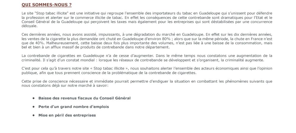 Le site "STOP tabac illicite" est une initiative qui regroupe l'ensemble des importateurs du tabac en Guadeloupe qui s’unissent pour défendre la profession et alerter sur le commerce illicite de tabac. En effet les conséquences de cette contrebande sont dramatiques pour l’Etat et le Conseil Général de la Guadeloupe qui perçoivent les taxes mais également pour les entreprises qui sont déstabilisées par une concurrence déloyale.