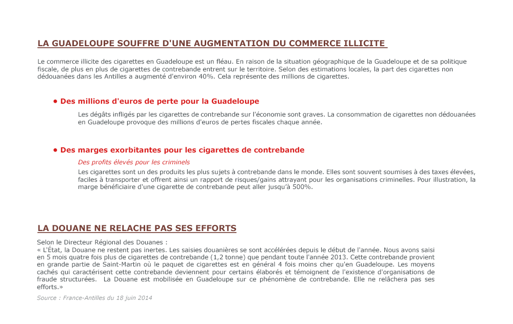 « L'État, la Douane ne restent pas inertes. Les saisies douanières se sont accélérées depuis le début de l'année. Nous avons saisi en 5 mois quatre fois plus de cigarettes de contrebande (1,2 tonne) que pendant toute l'année 2013. Cette contrebande provient en grande partie de Saint-Martin où le paquet de cigarettes est en général 4 fois moins cher qu'en Guadeloupe. Les moyens cachés qui caractérisent cette contrebande deviennent pour certains élaborés et témoignent de l'existence d'organisations de fraude structurées. La Douane est mobilisée en Guadeloupe sur ce phénomène de contrebande. Elle ne relâchera pas ses efforts.»